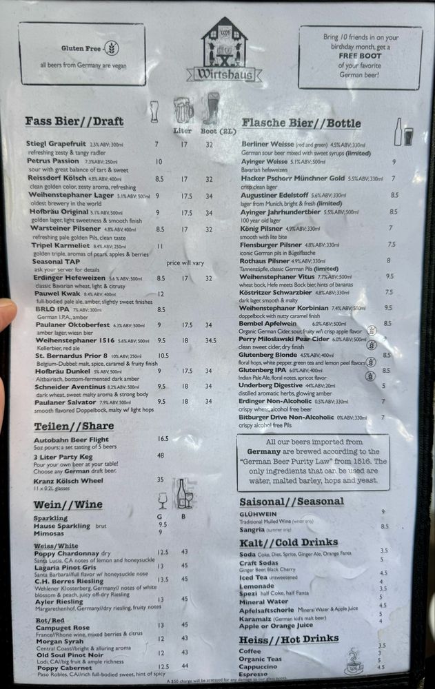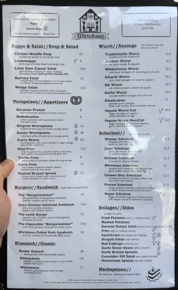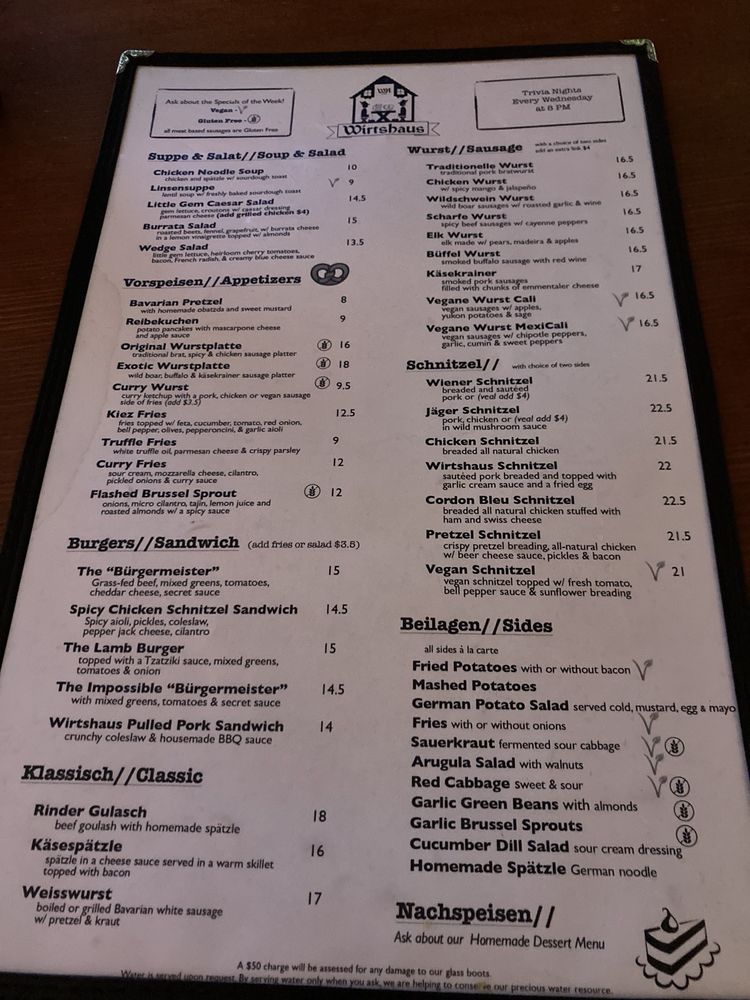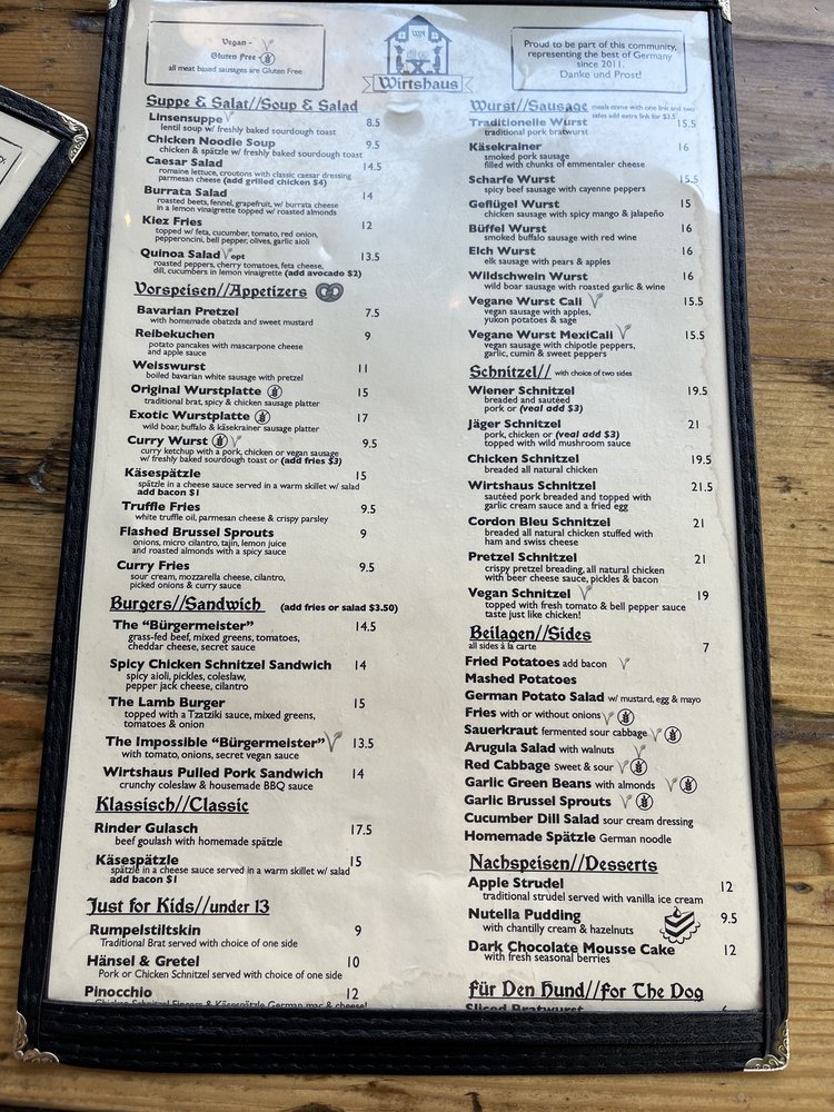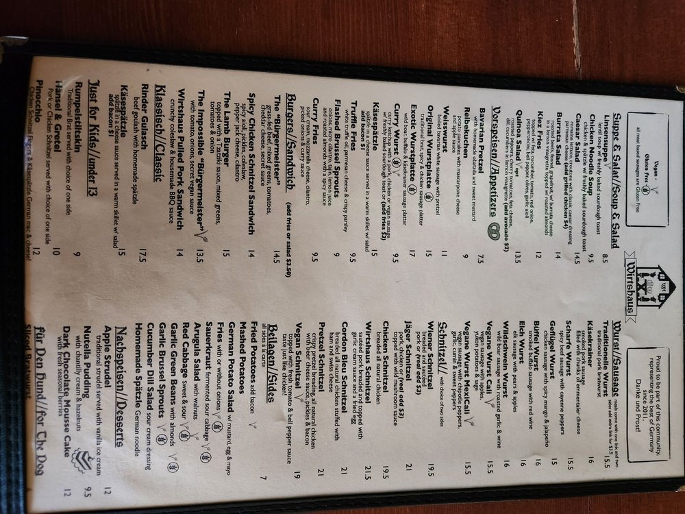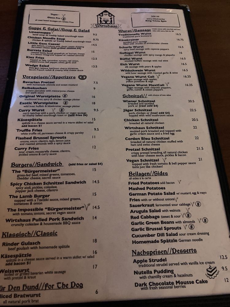Wirtshaus is a German beer garden and pub located in Los Angeles, offering a wide range of sausages, salads, soups, and appetizers. With options for vegan and limited vegetarian diets, the menu includes traditional dishes like wiener schnitzel, lentil soup, and potato pancakes. The restaurant provides a casual yet classy atmosphere with outdoor seating, good for groups and kids, especially on weekends. Customers praise the friendly service and delicious food, highlighting dishes like the Kasekrainer sausage platter and the Nutella budino dessert. The beer selection is impressive, perfect for enjoying with authentic German fare. Overall, Wirtshaus provides a taste of Germany in the heart of LA, making it a must-visit for those craving hearty and flavorful dishes in a lively setting.